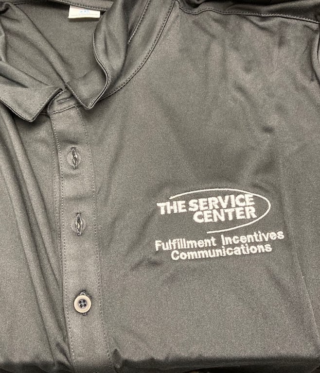 The image shows a close-up of a dark gray polo shirt featuring embroidered text that reads "The Service Center" along with "Fulfillment Incentives Communications.