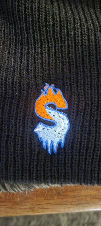 The image features a close-up of a black knitted fabric displaying a colorful embroidered logo with an orange and blue design.