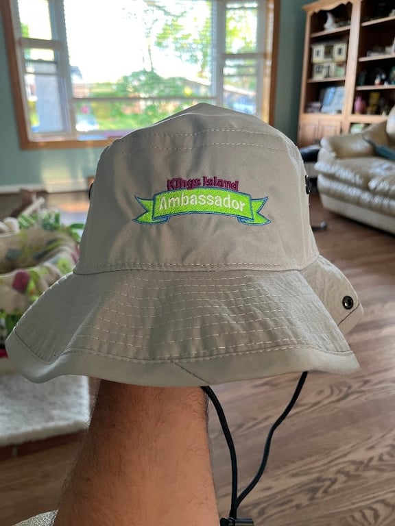The image features a light gray bucket hat with colorful embroidery that reads "Kings Island Ambassador.
