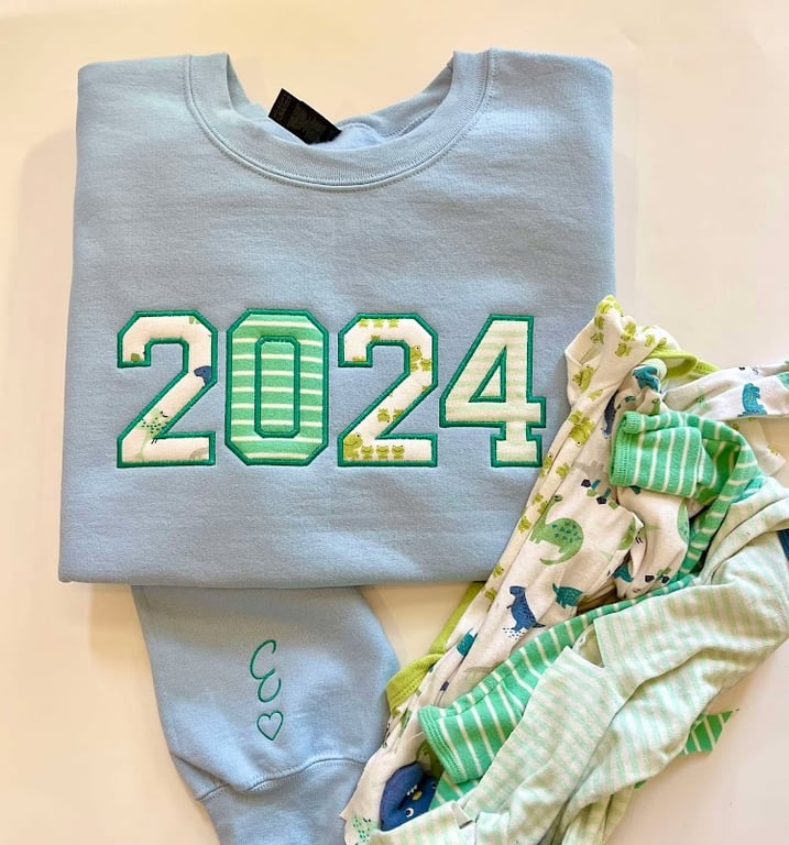 A light blue sweatshirt featuring the year "2024" in vibrant green embroidery is displayed alongside colorful, patterned fabric strips.