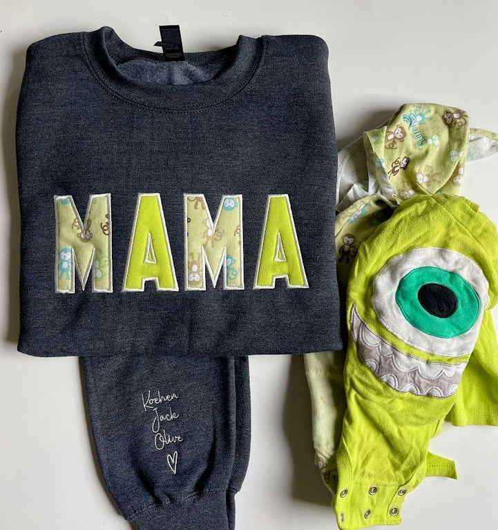 The image features a cozy gray sweatshirt with "MAMA" appliqué in bright green and patterned fabric, paired with matching pants.