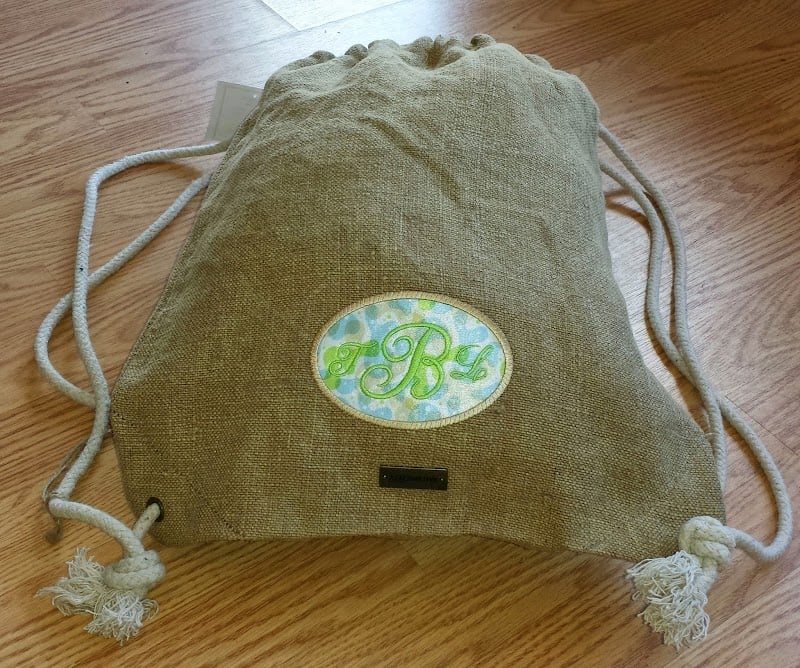 A drawstring bag made of natural fabric features a colorful embroidered logo. The setting showcases a warm wooden floor, typical of a cozy sewing store environment.