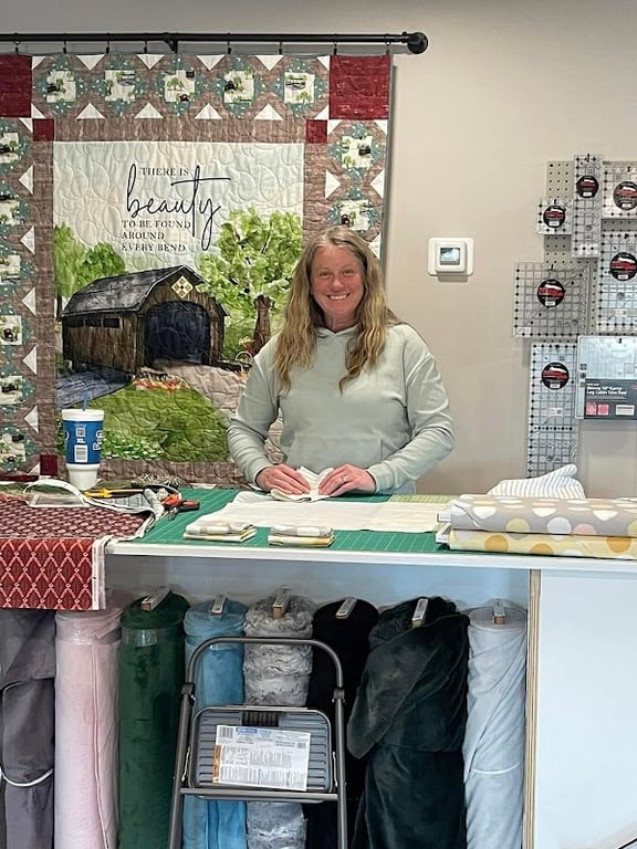 A smiling woman stands at a cutting table in Oh What A Stitch sewing store, surrounded by colorful fabrics and quilting supplies.