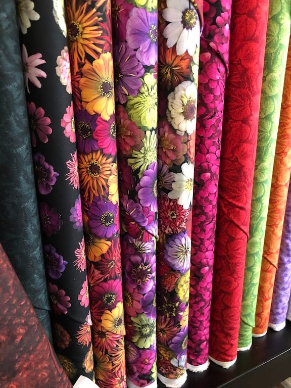 The image showcases vibrant rolls of floral and patterned fabrics displayed on shelves in The Quilting Grounds sewing store.
