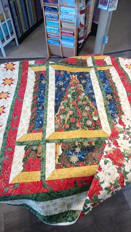 The image showcases a beautifully crafted quilt featuring vibrant holiday-themed patterns, including a Christmas tree and floral designs.