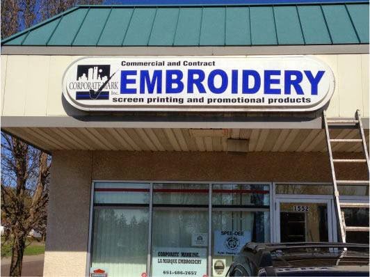 The image shows the exterior of Corporate Mark, a sewing and embroidery store. The storefront features a prominent sign displaying "EMBROIDERY" and offers accessible entry.