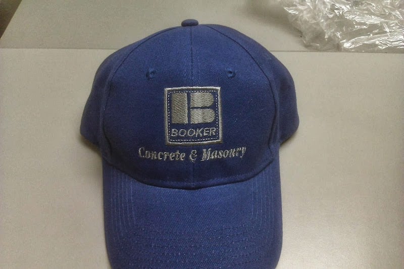 A blue baseball cap featuring embroidered text for "Booker Concrete & Masonry" rests on a flat surface, showcasing its branding.