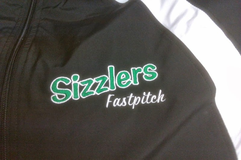 A close-up of a black jacket featuring green and white embroidered text that reads "Sizzlers Fastpitch," showcasing custom sports apparel.
