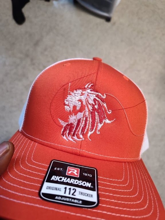 A close-up of an orange trucker hat featuring a white embroidered lion design. The hat displays a Richardson label, showcasing its adjustable fit.
