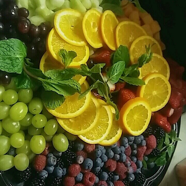 This image features a vibrant fruit platter arranged with slices of orange, strawberries, blueberries, green and black grapes, and mint leaves.