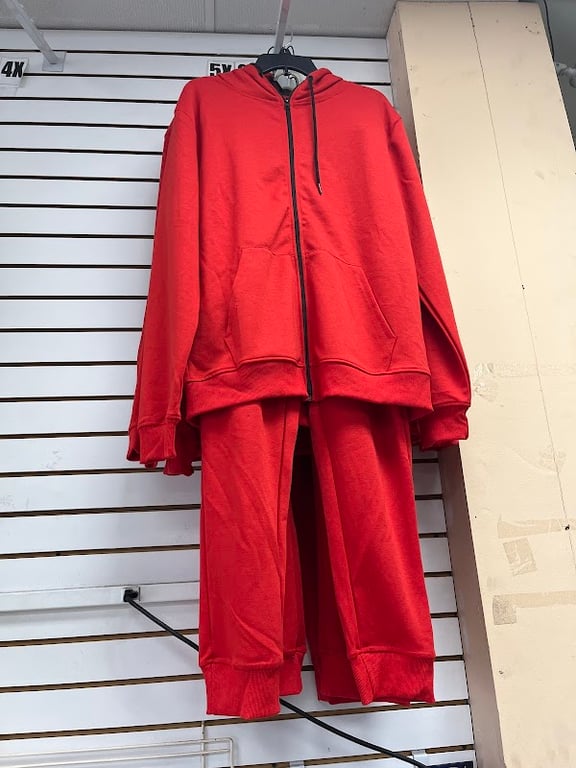 A vibrant red hoodie and matching sweatpants are displayed on a hanger against a slat wall in a sewing store.