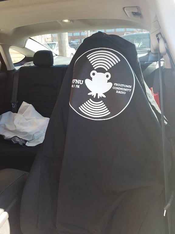 The image shows a black hoodie with a frog logo draped over the back seat of a car. The interior features a simple design with a glimpse of a white fabric nearby.