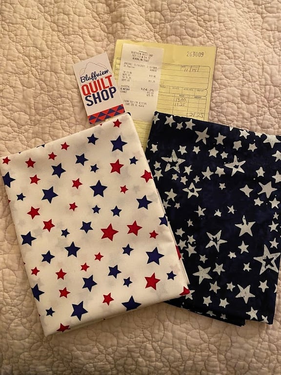 The image features two fabric pieces from Bluffview Quilt Shop, one with red and blue stars on a white background and the other in navy with white stars.