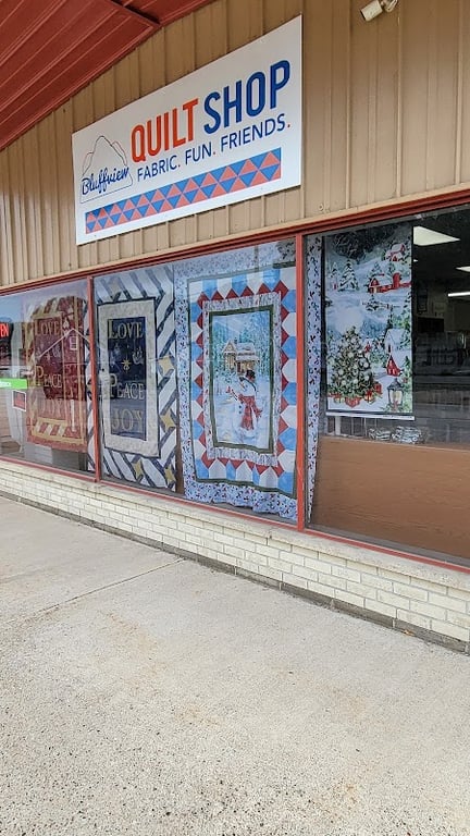 The photo shows the exterior of Bluffview Quilt Shop, featuring colorful quilt displays in the windows. The shop's sign highlights its focus on fabric and sewing supplies.