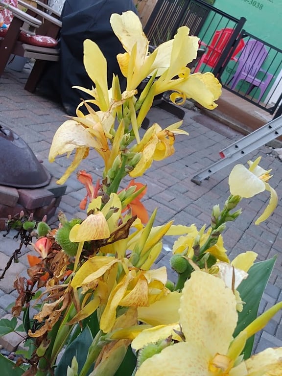 The image features vibrant yellow canna lilies in a garden setting, surrounded by brick pathways and outdoor furniture.