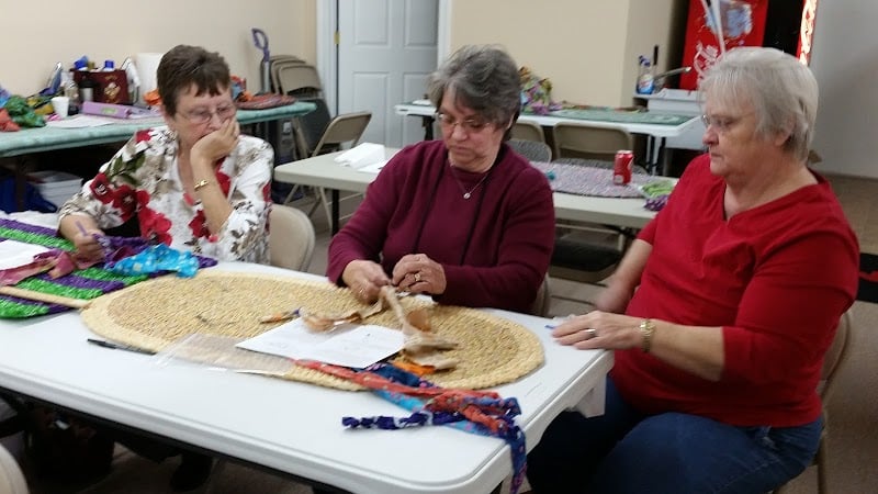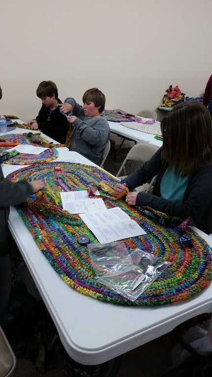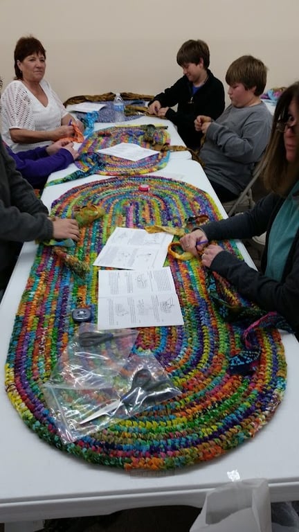 A group of four individuals is engaged in a sewing workshop at The Stitchin' Post LLC, surrounded by colorful, braided fabric projects on tables.