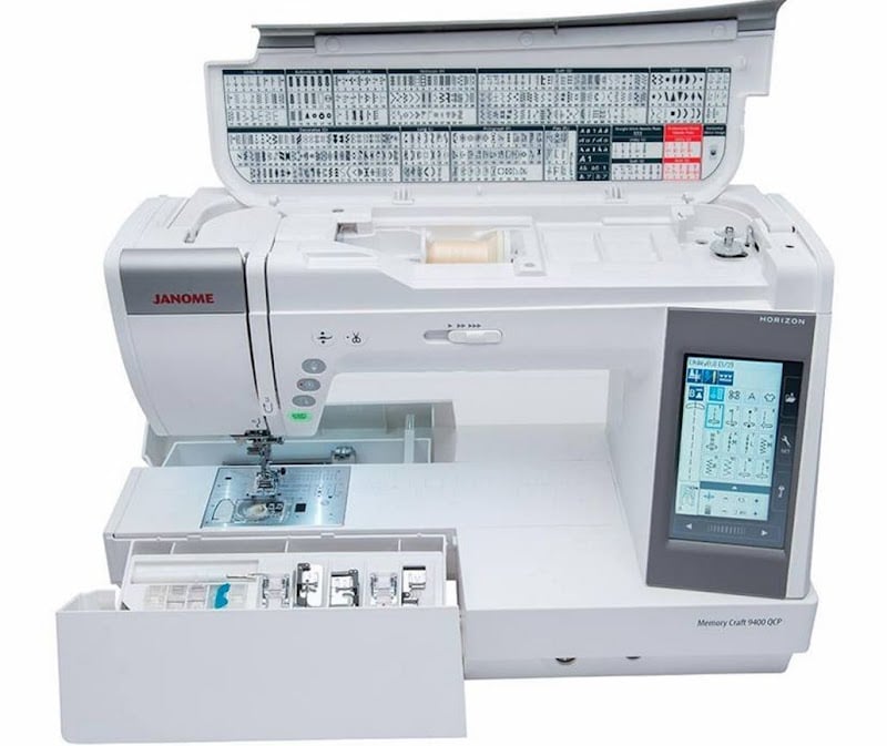 The image features a Janome Memory Craft 9400 QCP sewing machine, showcasing its advanced features and digital interface.