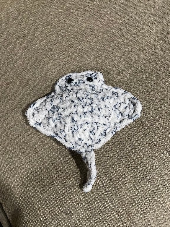 This image features a handmade, crocheted stingray plush in soft white and blue yarn, with black button eyes.