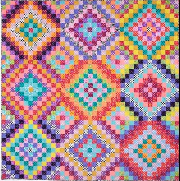 A vibrant quilt featuring a geometric pattern of colorful diamonds and squares is displayed prominently.