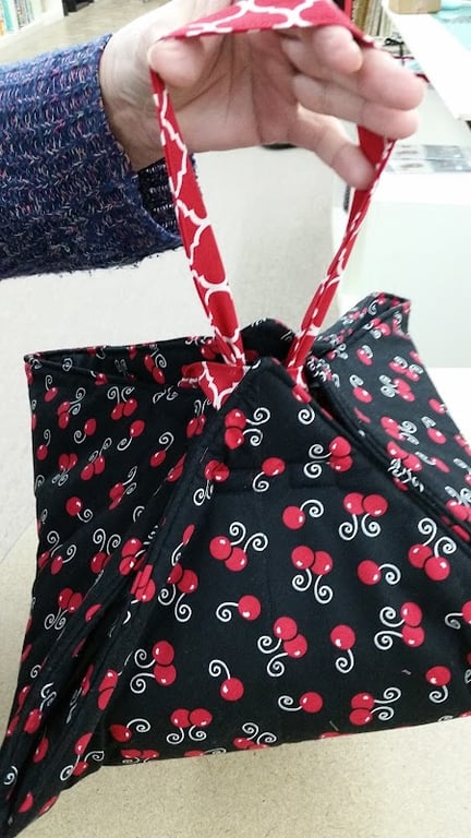 A person holds a handmade bag featuring a black fabric adorned with red cherries and swirls.