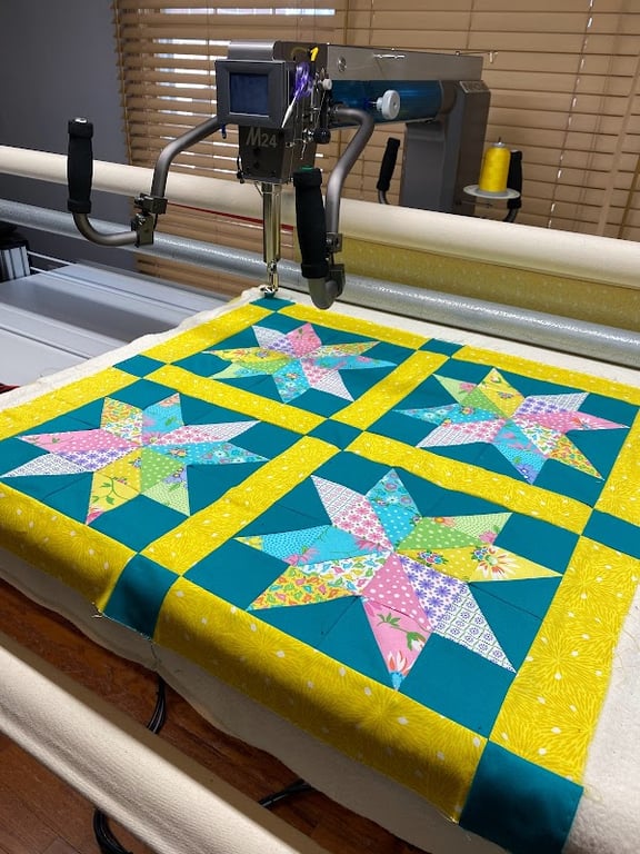 The image showcases a quilting machine in a well-lit sewing store, with a vibrant quilt featuring star patterns in teal, yellow, and various floral fabrics.