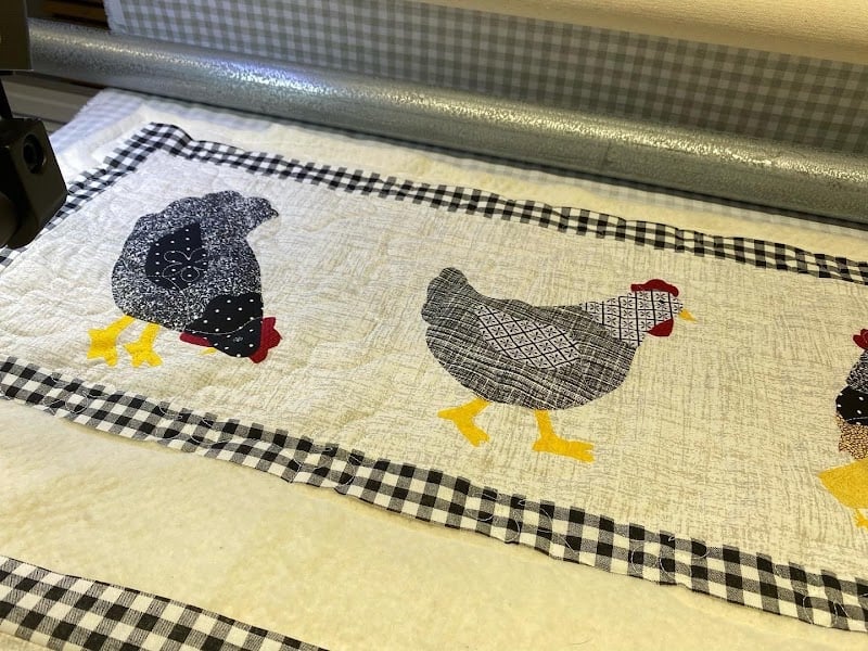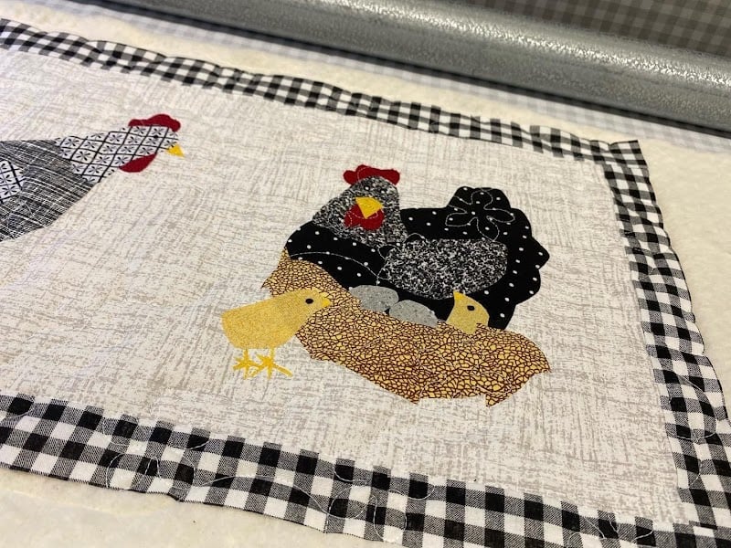 The image features a quilted fabric panel showcasing colorful chicken and chick appliqués on a textured background.