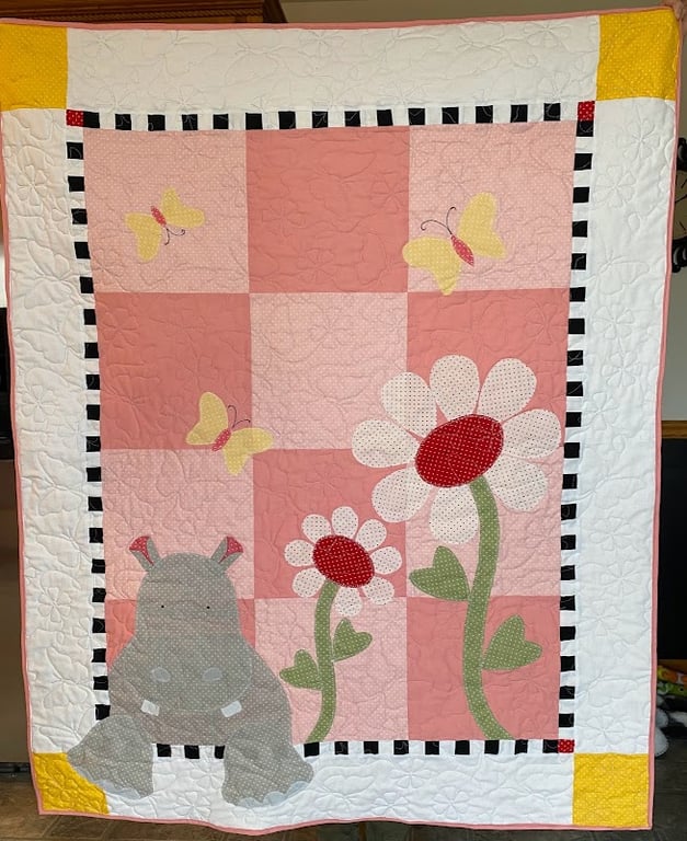 The image features a colorful quilt displayed in a sewing store, showcasing a playful design with a gray hippo, flowers, and butterflies.