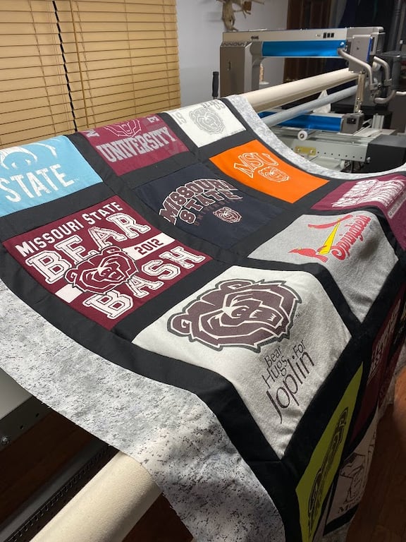 The image showcases a colorful quilt featuring various t-shirt designs, prominently displayed on a quilting machine in a sewing store.