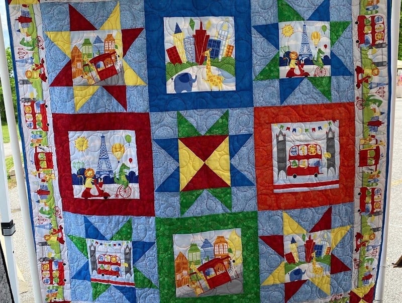 A colorful quilt featuring playful city scenes and vibrant star patterns hangs prominently in Woodland Quilting, LLC.