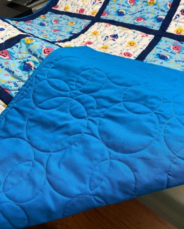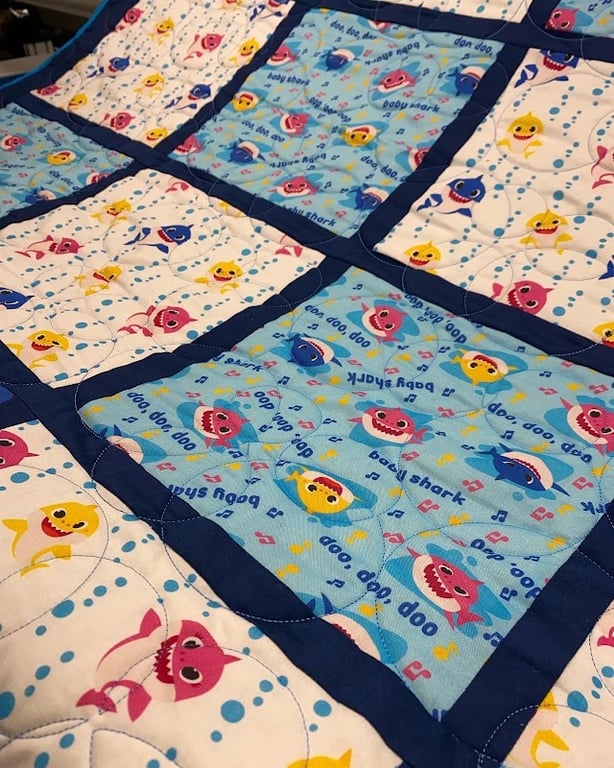 The image features a colorful quilt made from playful "Baby Shark" themed fabrics, showcasing vibrant patterns of sharks and musical notes.