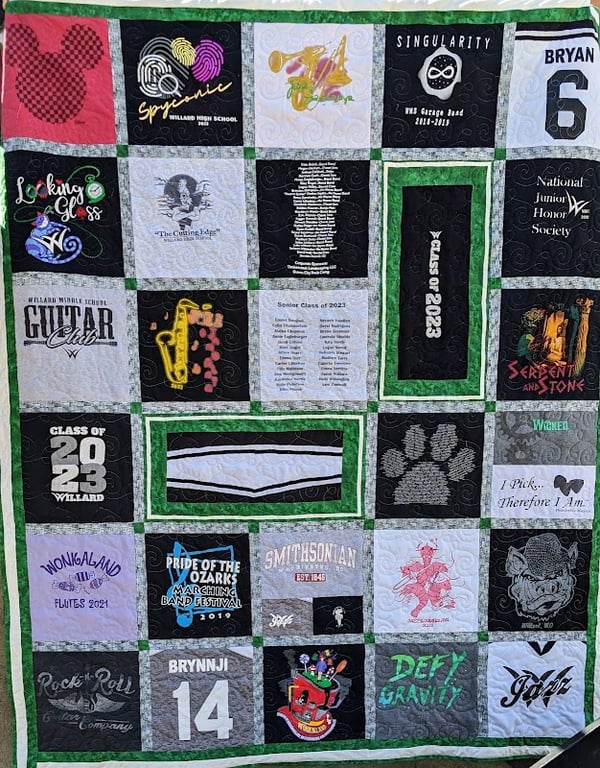 The image features a colorful quilt made from various T-shirt squares, showcasing school logos and event themes.