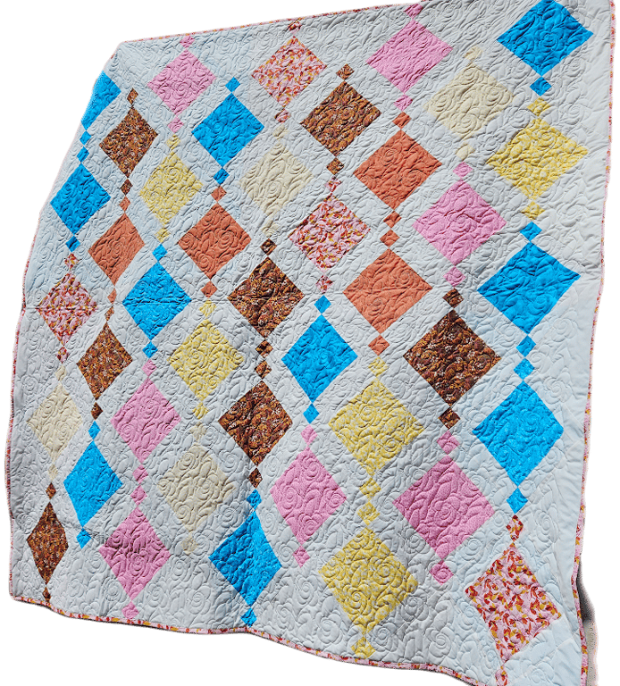 A colorful quilt featuring a diamond pattern in pastel and vibrant hues is displayed prominently.