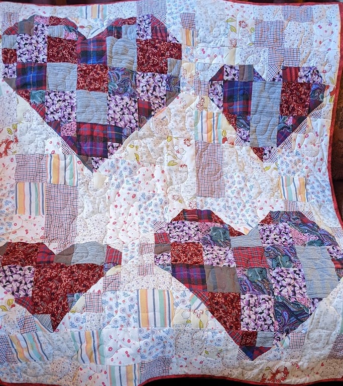 The image features a beautifully crafted quilt adorned with heart patterns in various fabrics, including floral and plaid designs.