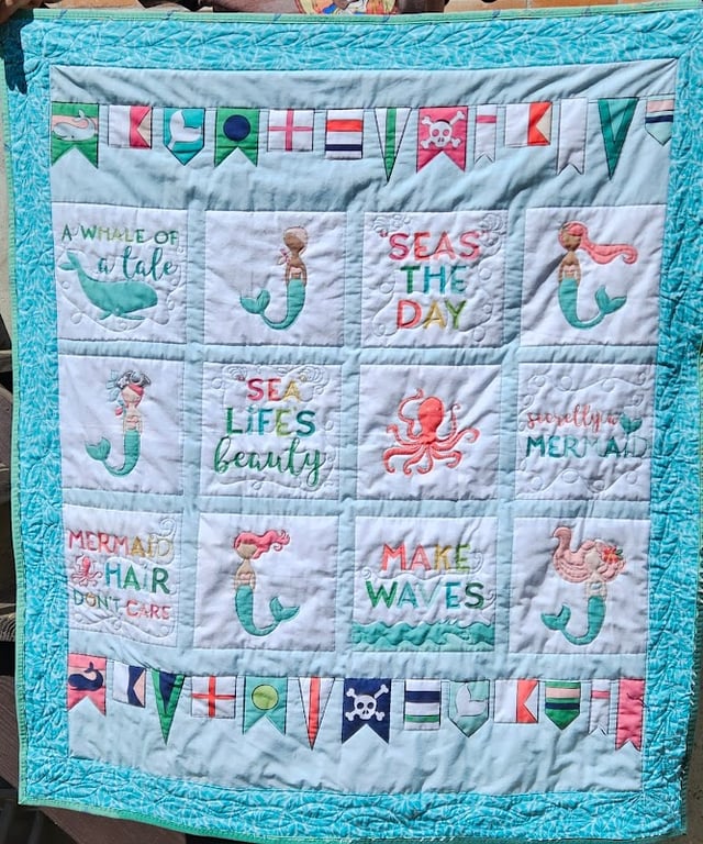 The image features a vibrant quilt displayed in a sewing store, showcasing nautical-themed squares with playful designs and phrases.