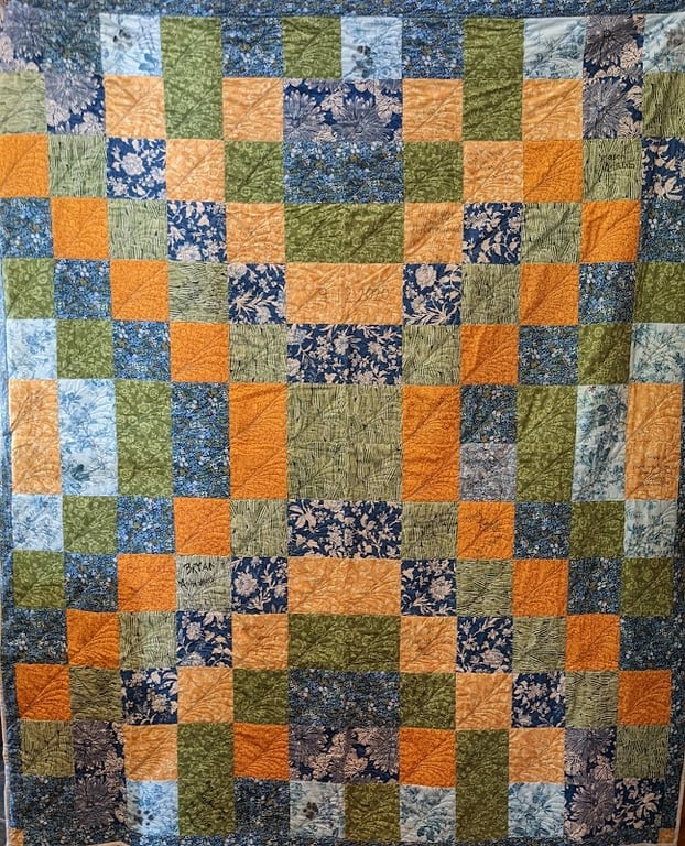 A vibrant quilt features a patchwork of blue, green, orange, and floral patterns, showcasing the artistry of sewing.