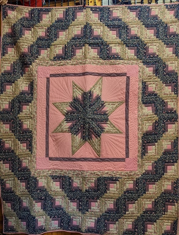 A beautifully crafted quilt hangs prominently in the sewing store, showcasing intricate patterns in pink, navy, and gold.
