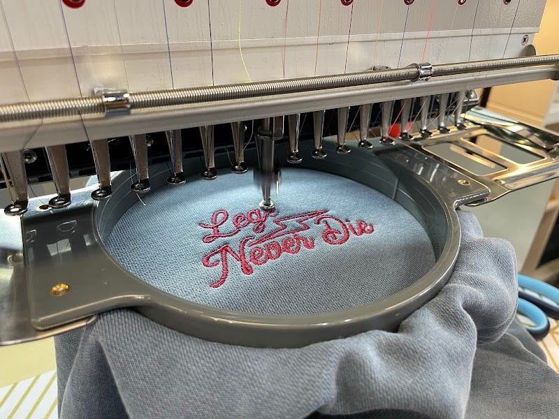 The image shows an embroidery machine in action, stitching the phrase "Legs Never Die" onto a blue fabric.