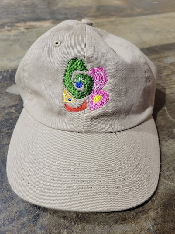 A beige baseball cap featuring colorful embroidered designs, including the numbers "6" and "8," is displayed on a textured surface.