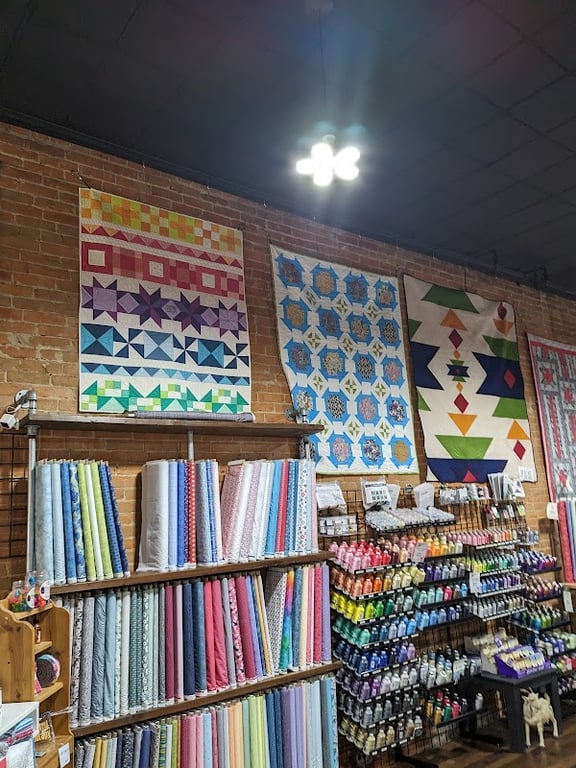 The image shows a vibrant sewing store interior filled with colorful fabrics and quilting supplies.