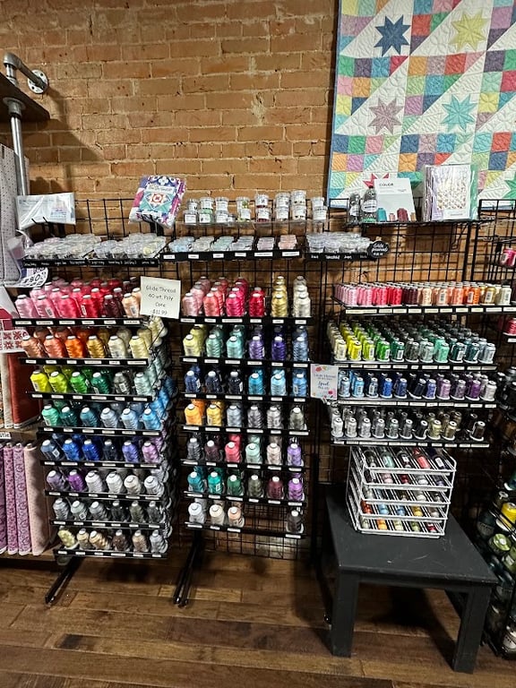 The image showcases a vibrant display of sewing threads in various colors, neatly organized on black shelving.