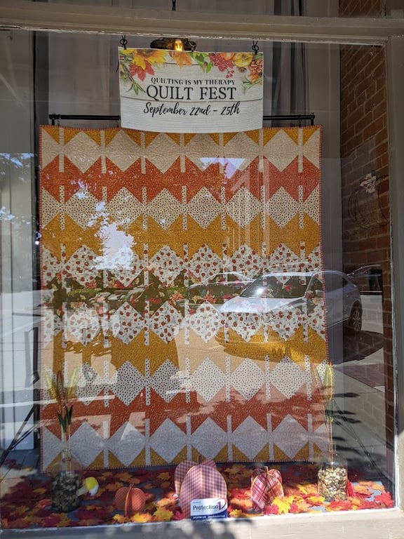 The image showcases a vibrant quilt displayed in the window of "Quilting Is My Therapy," featuring autumn colors and patterns.
