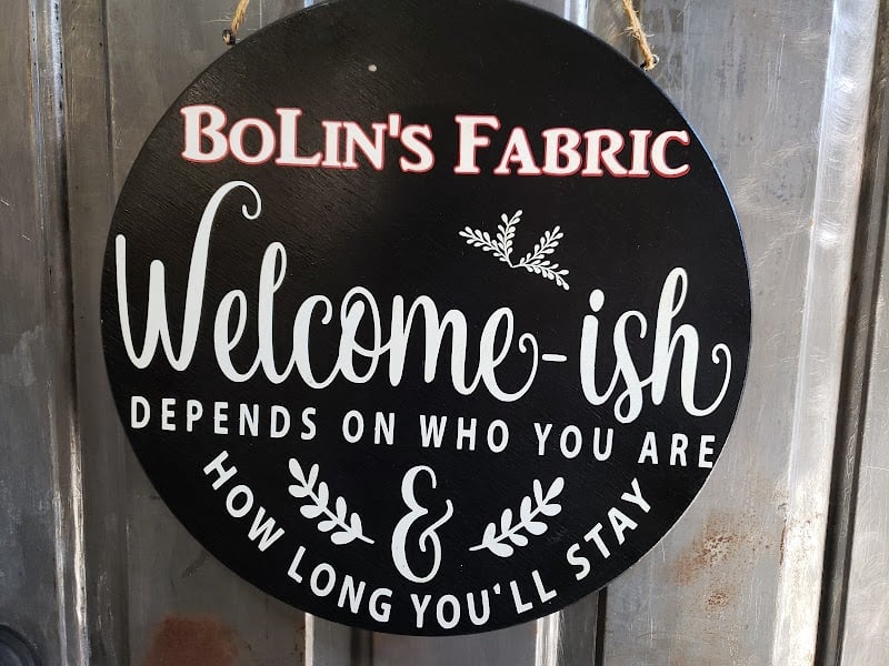 A round sign at BoLin's Fabric features the store name and a playful welcome message. The black background contrasts with white and red lettering, creating an inviting atmosphere.