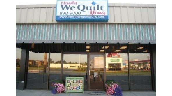 The image shows the exterior of Merrily We Quilt Along, a sewing store with a welcoming entrance.