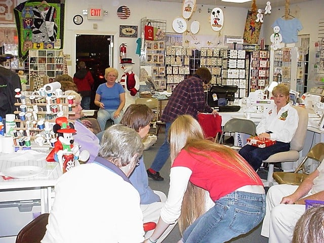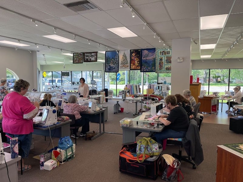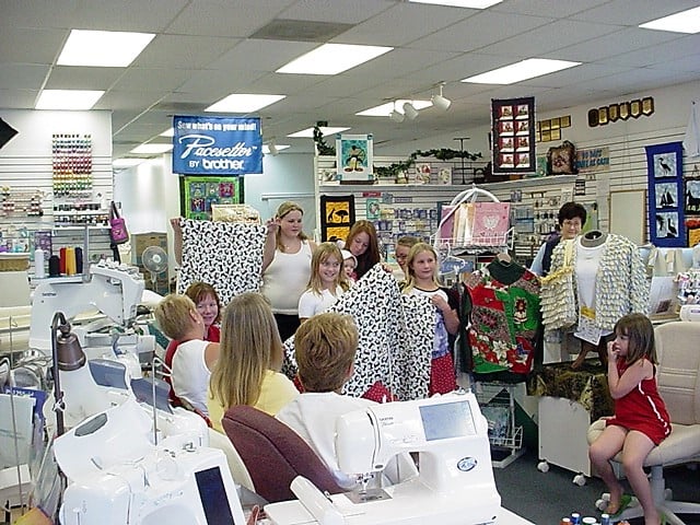 The image shows a vibrant sewing store interior with several sewing machines in use by customers.