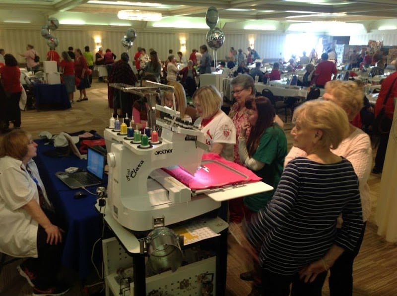The image shows a lively sewing event at Heyde Sewing Machine Co, featuring a Brother embroidery machine in use.