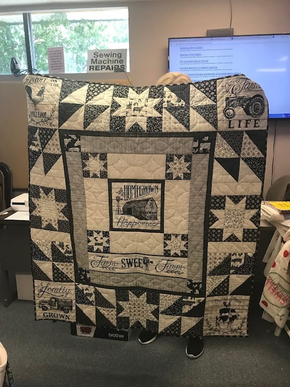 A person holds up a beautifully crafted quilt featuring a black and white star pattern with farm-themed designs.