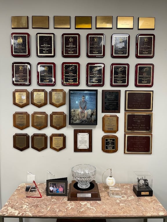 The image features a wall adorned with numerous awards and plaques, showcasing the achievements of Heyde Sewing Machine Co.