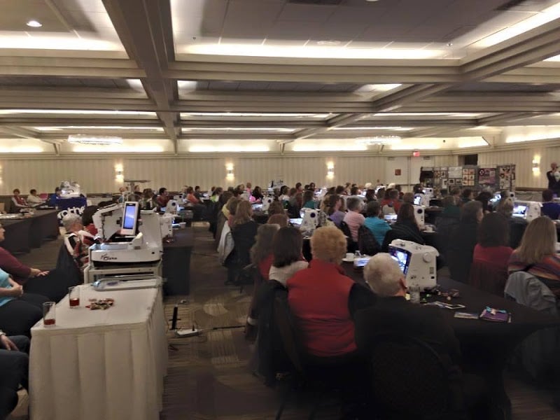 A large group of people is seated at tables in a well-lit conference room, engaged in a sewing workshop.