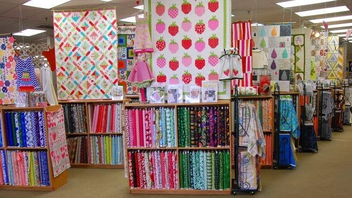 The image shows the interior of Jackman's Fabrics, featuring shelves stocked with colorful fabrics and quilting supplies.