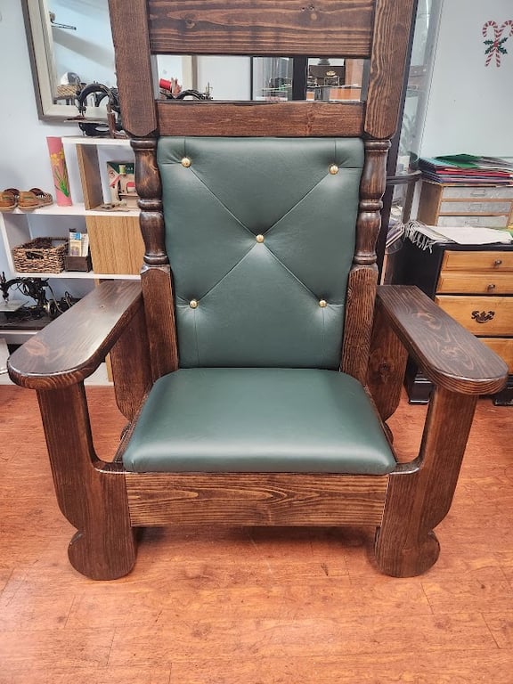 The image features a sturdy wooden chair with a green upholstered seat and back, adorned with decorative gold buttons.